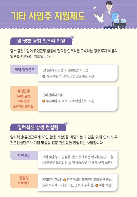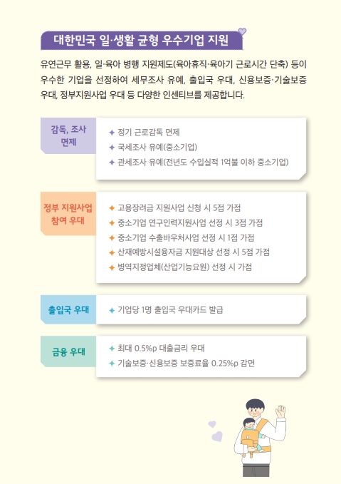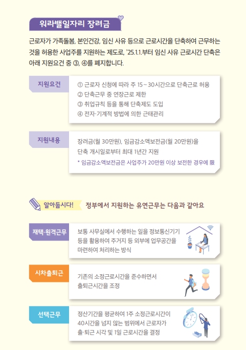 기업 입장에서도 대체인력 지원금, 유연근무 장려금, 일·생활 균형 우수기업 인센티브 등 다양한 지원이 강화되므로, 제도를 적극 활용하는 것이 중요합니다.