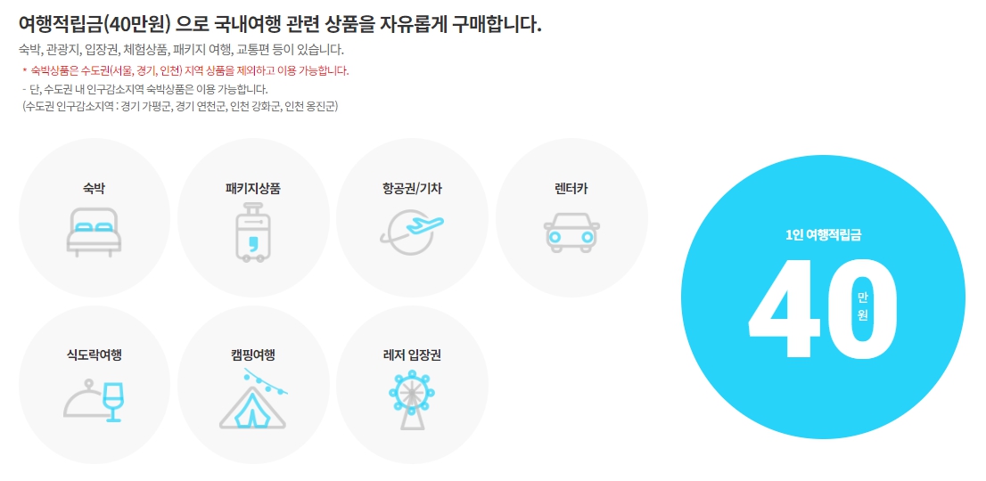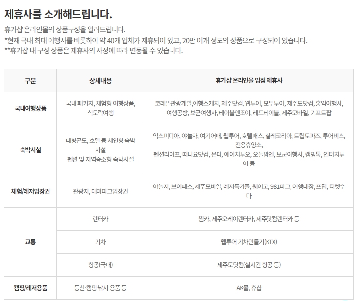 적립된 여행 경비는 전용 플랫폼인 ‘휴가샵’과 모바일 애플리케이션을 통해 숙박, 교통, 기획상품, 관광지 입장권 등 국내 여행 관련 상품을 자유롭게 구매할 수 있습니다.