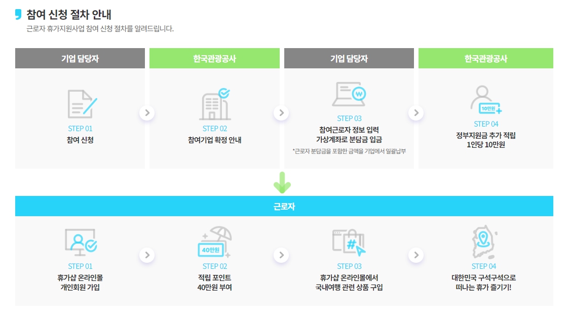 참여를 원하는 기업은 공식 누리집에서 신청할 수 있으며, 선정된 기업과 근로자는 적립금을 조성한 후 전용 플랫폼 ‘휴가샵’에서 여행 관련 상품을 구매할 수 있습니다.