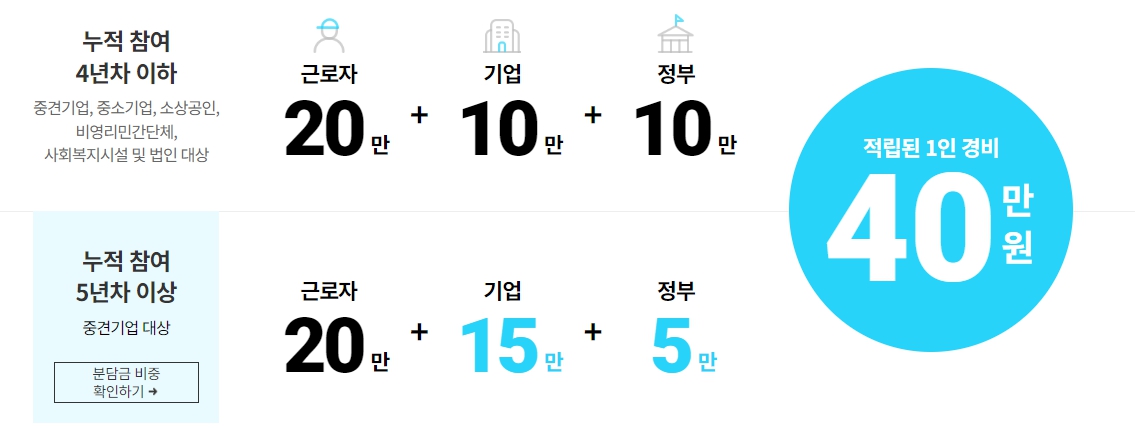 ⚠ 중견기업 근로자는 올해부터 지원 대상에서 제외되었으며, 누적 참여 5년 차 중소기업은 기업 부담금이 기존 10만 원에서 15만 원으로 조정되었습니다.
