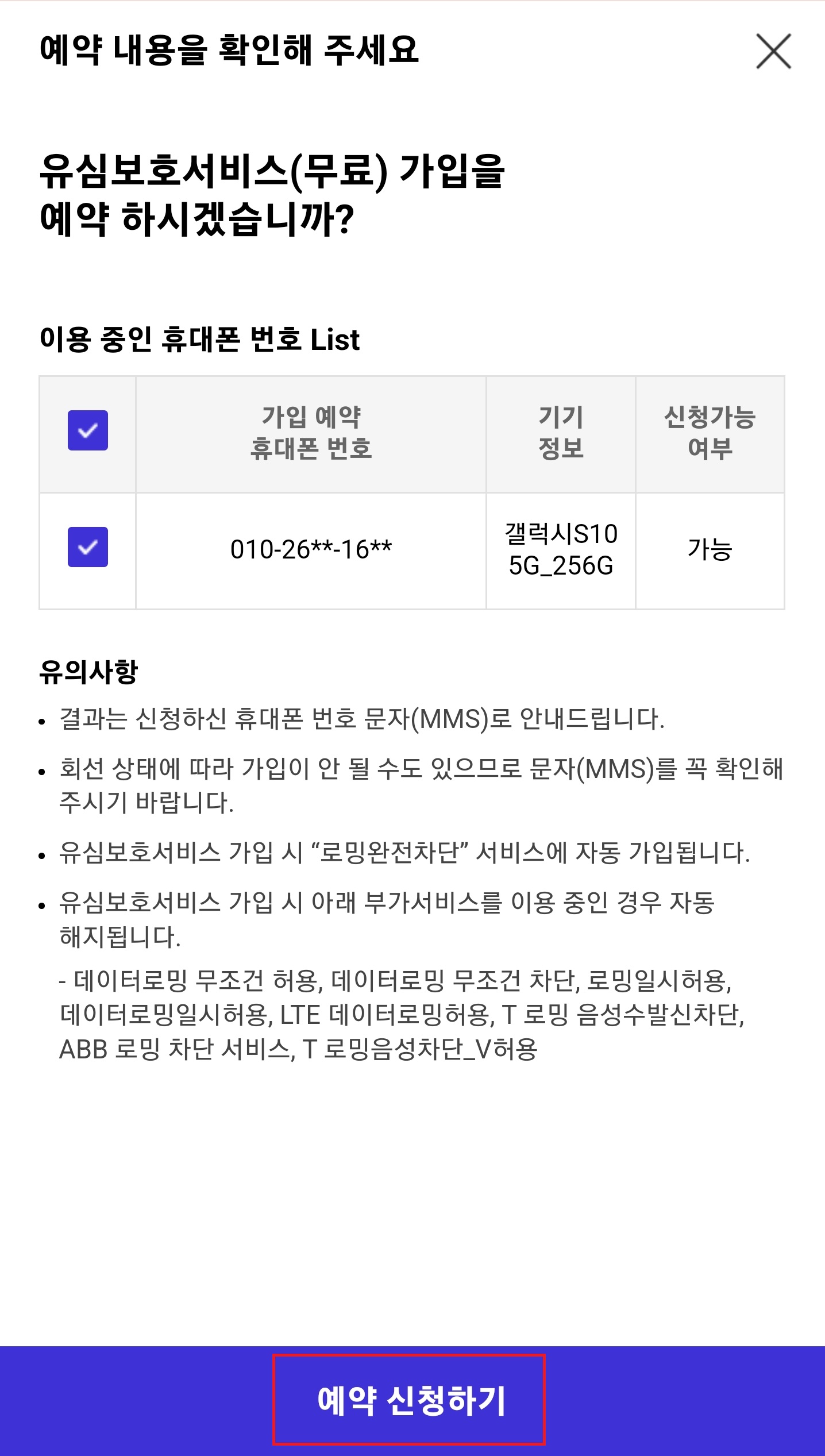 - 로밍 요금제 사용자는 불가: