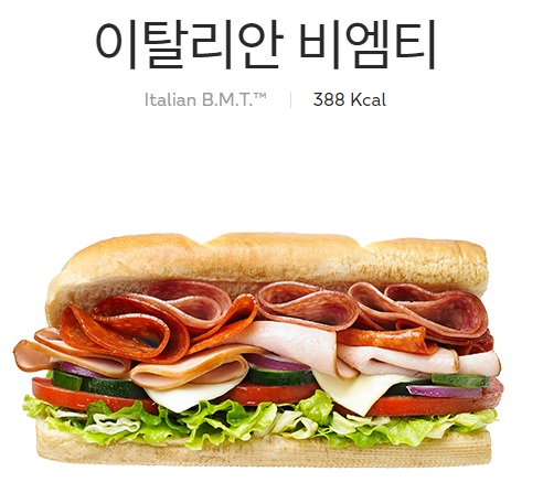 이탈리안 B.M.T는 서브웨이의 대표 메뉴로, 페퍼로니, 살라미, 햄이 풍부하게 들어간 클래식한 샌드위치입니다.