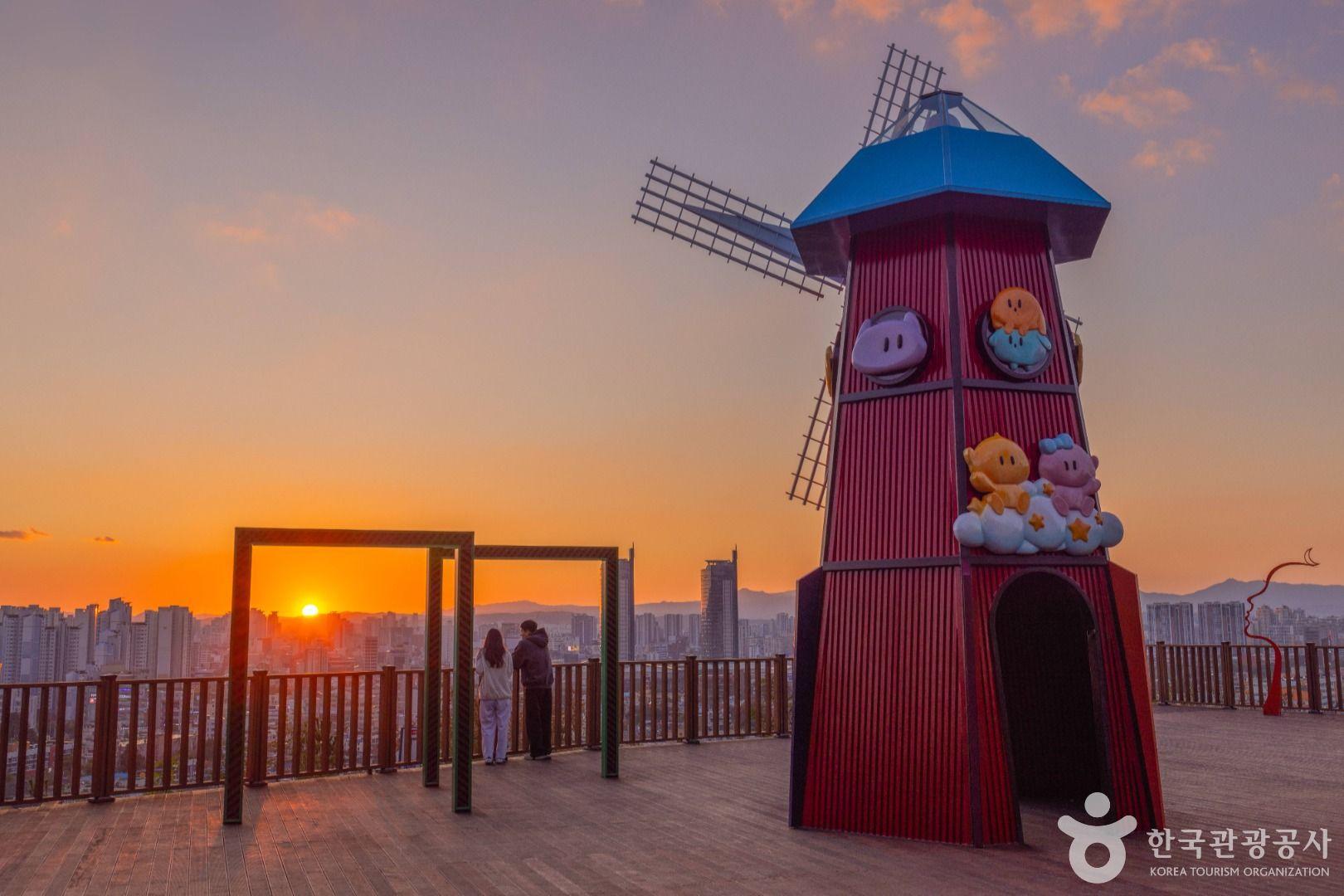 대동하늘공원에는 공원의 상징과도 같은 풍차가 있는 곳이 노을 명소로 소문난 곳이다. 그러니 해가 지기 전에 풍차에 도착해야 풍차가 돌아가는 동산에 서서 도시 너머로 노을이 지는 풍경을 제대로 감상할수 있다.