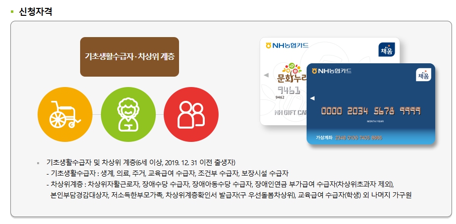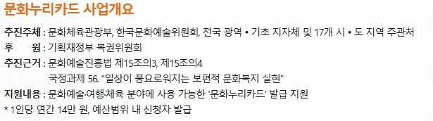 올해 문화누리카드는 6세 이상 기초생활수급자 및 법정 차상위계층을 대상으로 지원합니다. 지원 대상은 전년보다 6만 명이 늘어난 264만 명으로 확대되었습니다. 문체부는 지원 대상을 꾸준히 늘리고, 누구나 혜택을 놓치지 않도록 안내 서비스를 강화해 미수혜자 발굴에 적극 나설 방침입니다.